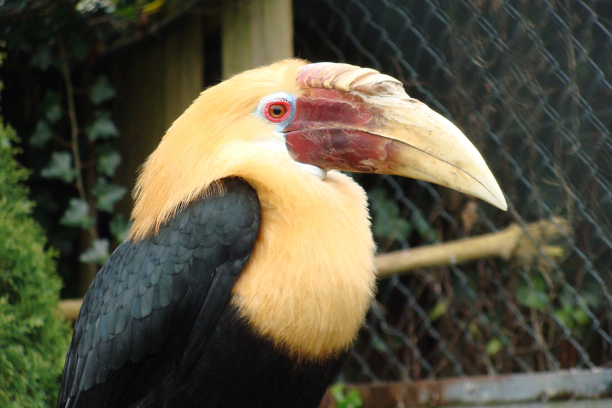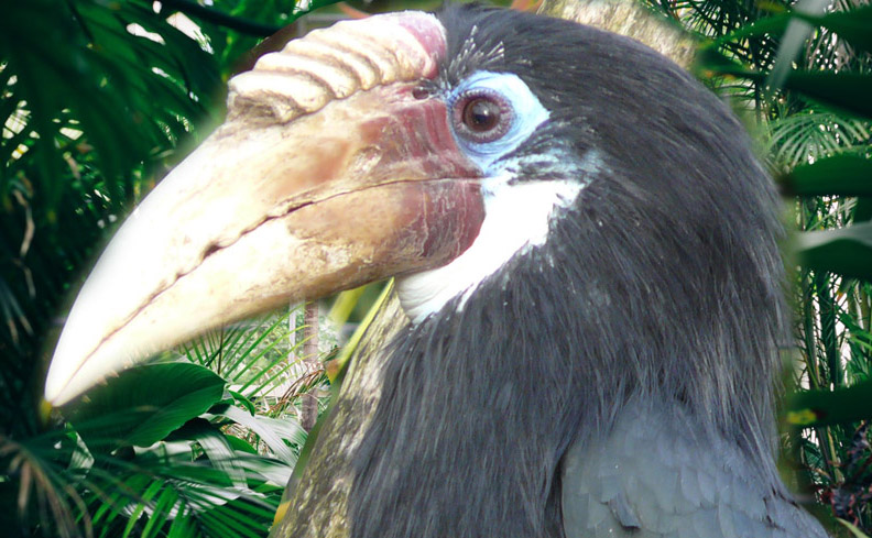 De oogring en de keel zijn kaal en blauw van kleur. De ogen hebben huidkleurige oogleden.
