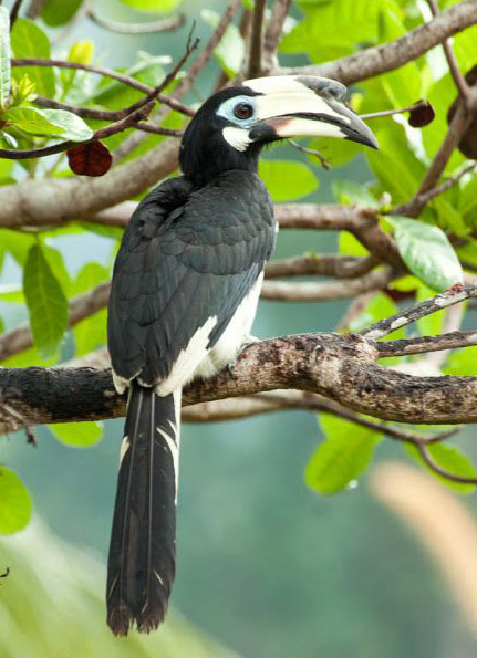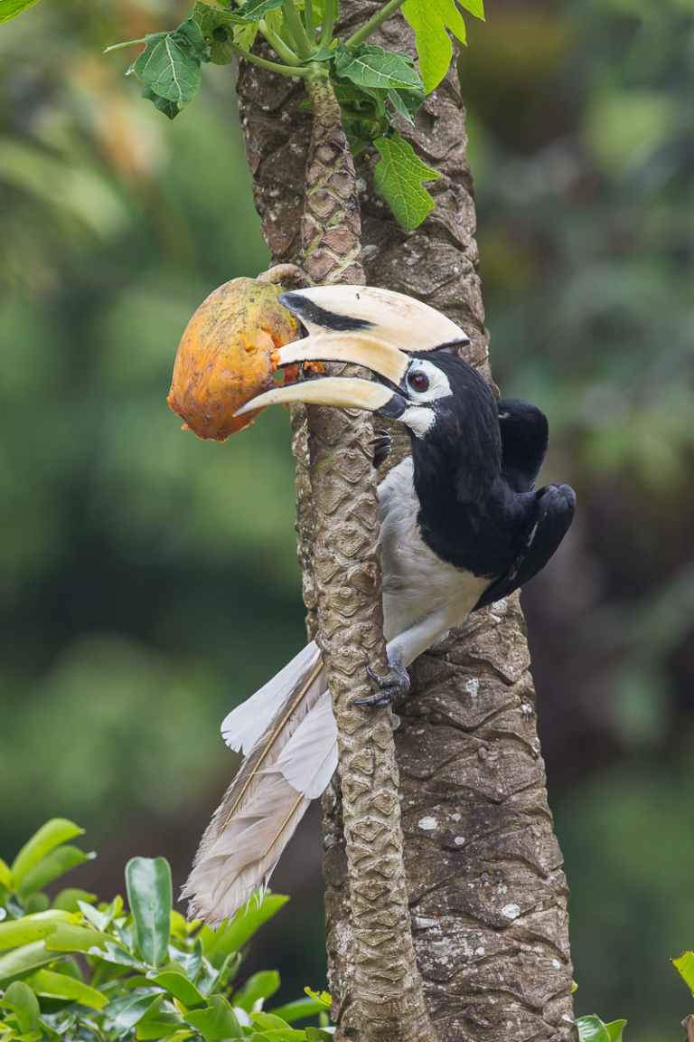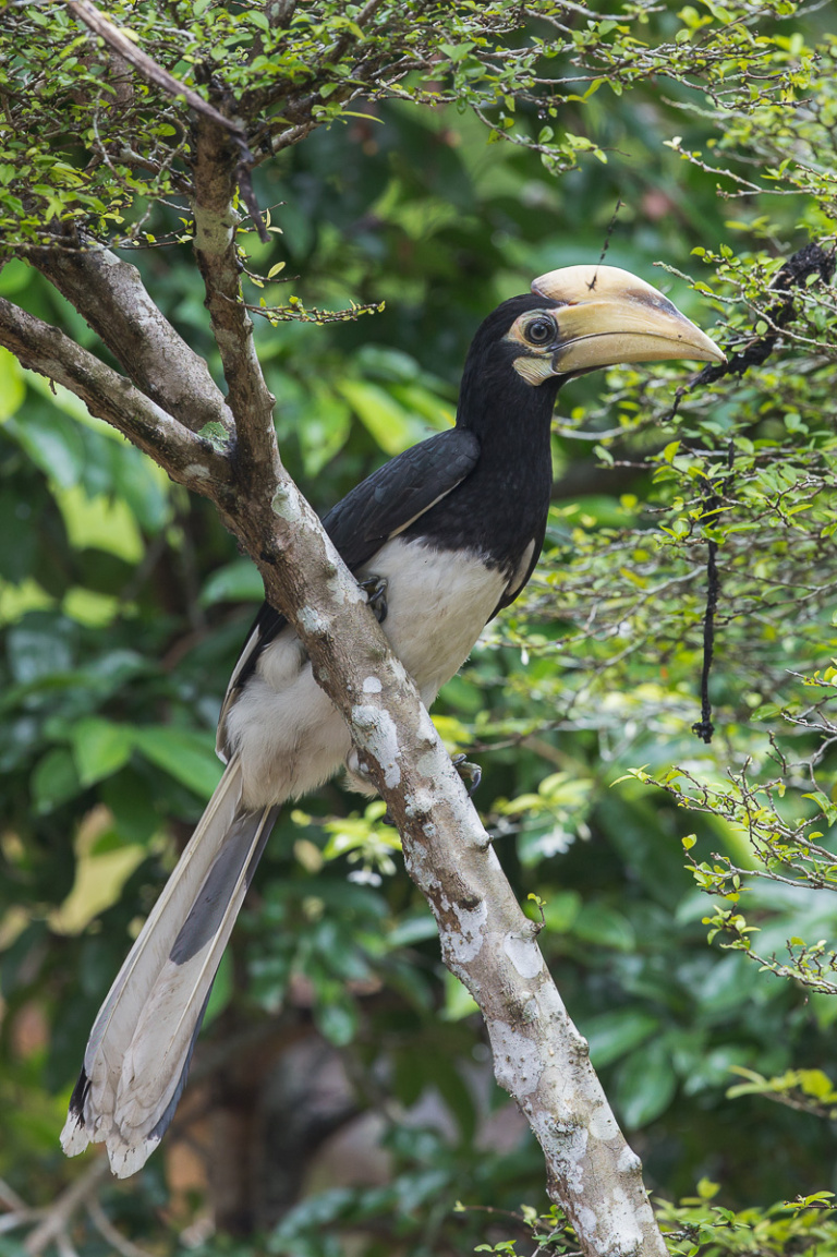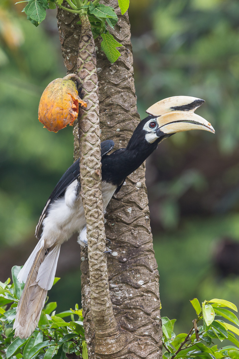 De snavel en de helm zijn geel en er loopt een zwarte vlek die begint bij de punt van de helm tot aan de punt van de snavel.