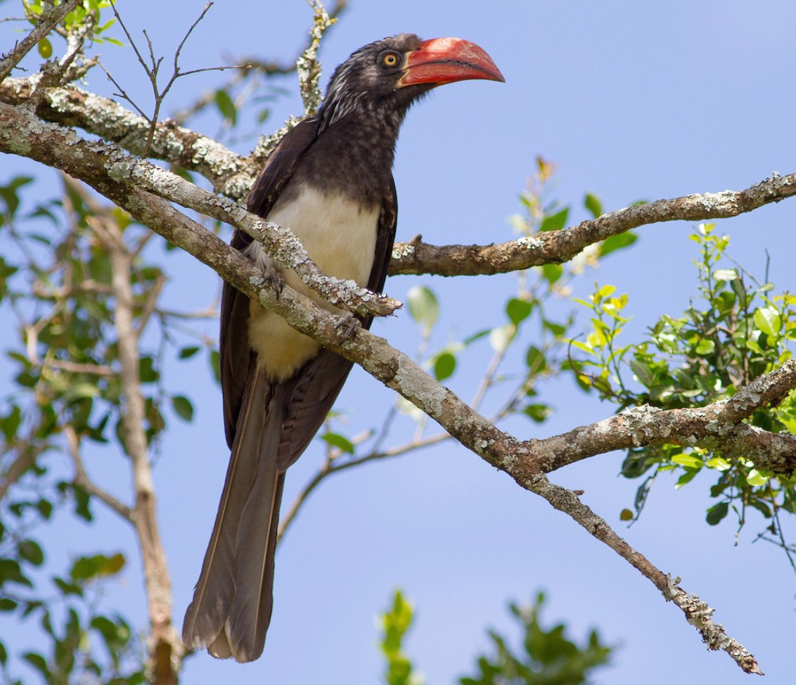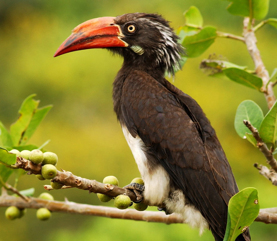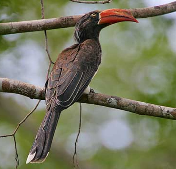 De snavel is rood tot dieporanje gekleurd en heeft een geel randje aan de snavelbasis.